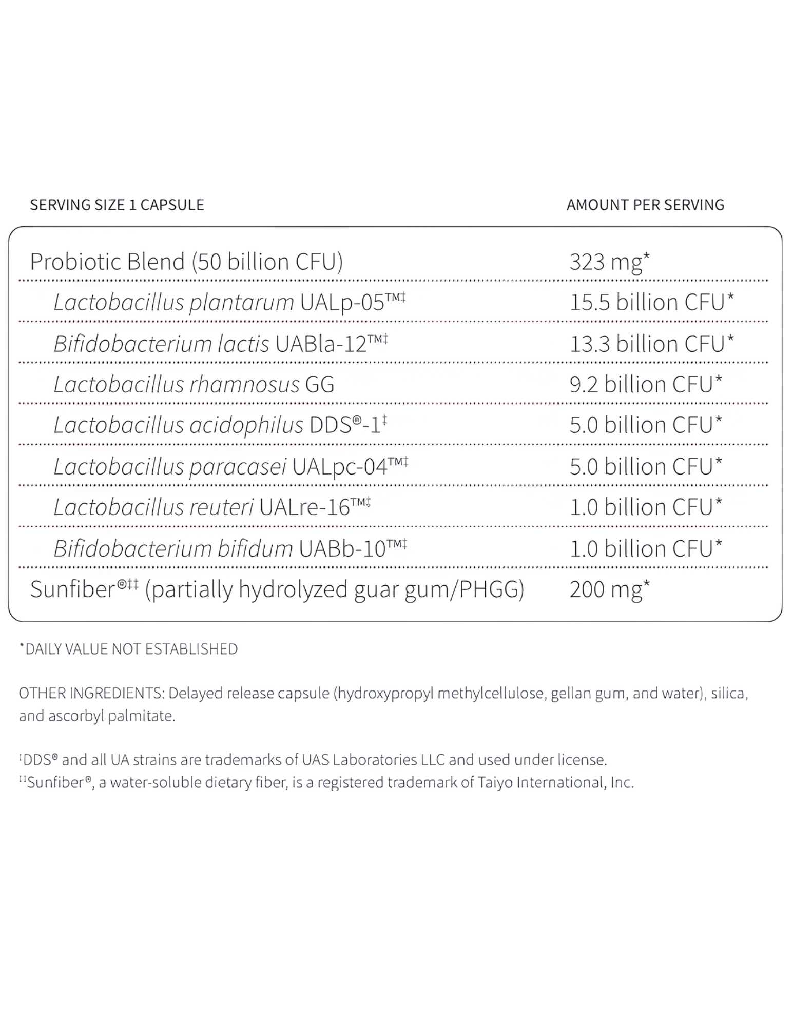 Delayed-release capsule (hydroxypropyl methylcellulose, gellan gum, water), silica, and ascorbyl palmitate.